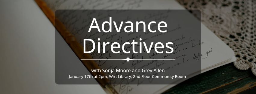 The Asterix* presents Advanced Directives with Sonja Moore and Grey Allen. Learn how to create a legally binding medical Advanced Directive to ensure you receive the medical care you want, and to make sure the person of your choosing can lawfully make medical decisions for you. This workshop is taking place January 17 at 2pm in the second floor community room at Wirt Library. Please bring writing utensils! Forms will be provided