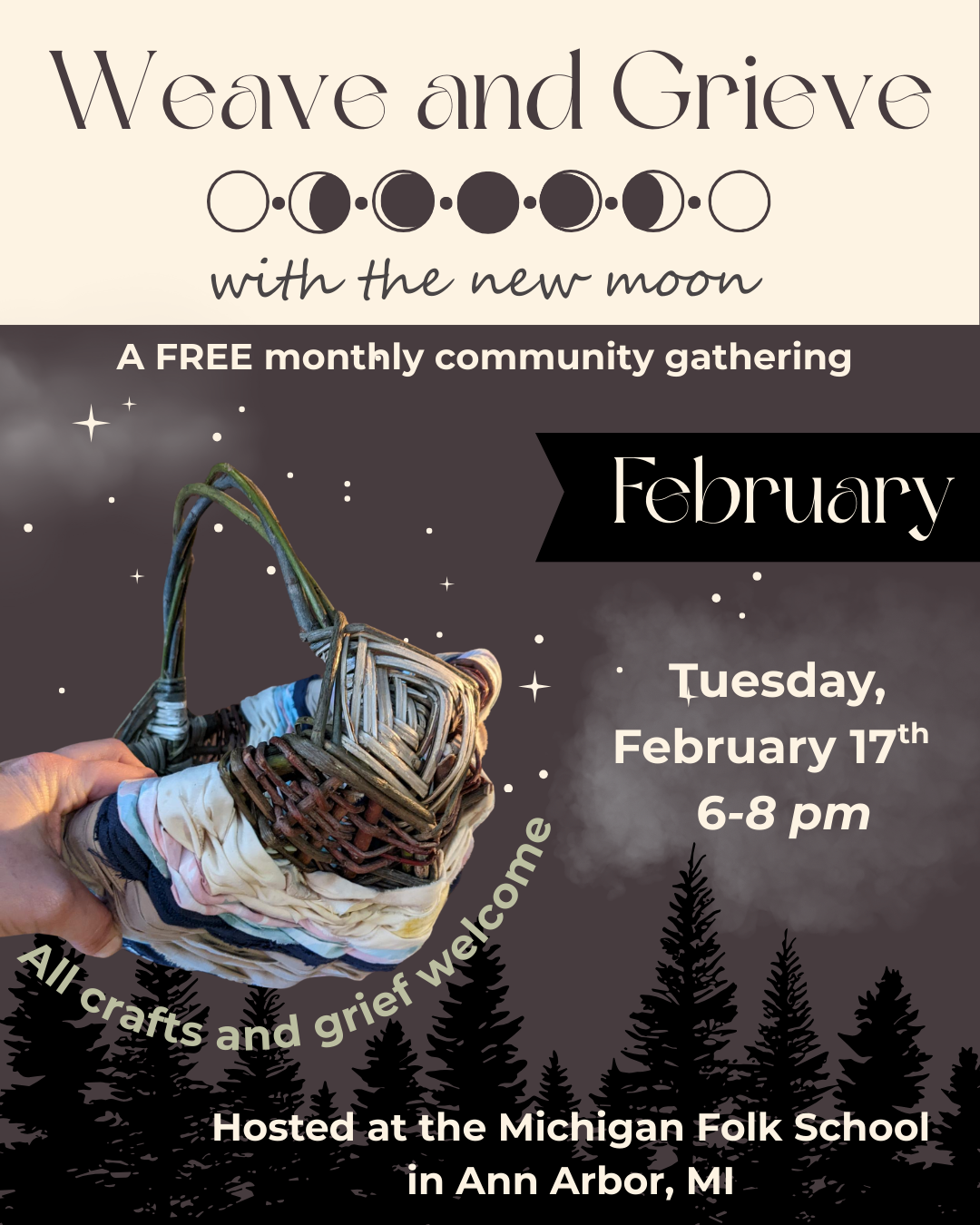 MFS Instructor Michael Marie is a fiber and funerary artisan who intricately weaves the worlds of craft and grief together through her work and believes in the power of community. Though named a Weave and Grieve, you may bring just about any craft project to work on — just make sure to be respectful of the space. Crafts where you can easily “find your flow” are ideal for processing grief. Don’t have a project going? Don’t fret! We will have a basket frame available to borrow and weave upcycled fiber into, no experience required.